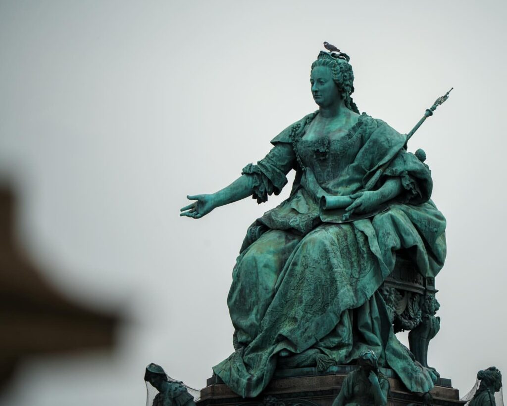 In Vienna’s Maria-Theresien-Platz stands the prominent monument to Empress Maria Theresa (1717-1780), the Habsburgs’ only female sovereign—seen here momentarily adorned with a rather informal avian visitor. Unveiled in 1888 and primarily the work of sculptor Kaspar von Zumbusch, this grand bronze depicts the influential 18th-century ruler enthroned, holding the Pragmatic Sanction which secured her succession. The monument is also notable for the array of statues at her feet, representing key military, political, and cultural figures from her era, thereby highlighting the comprehensive impact of her reforms and long reign over the Austrian state.