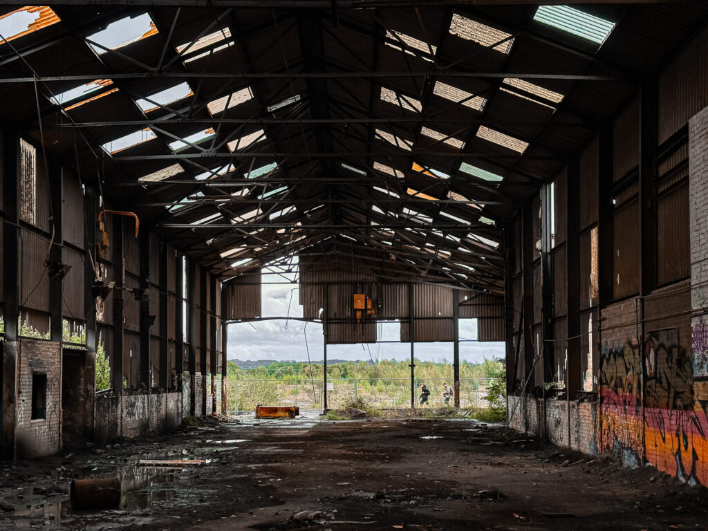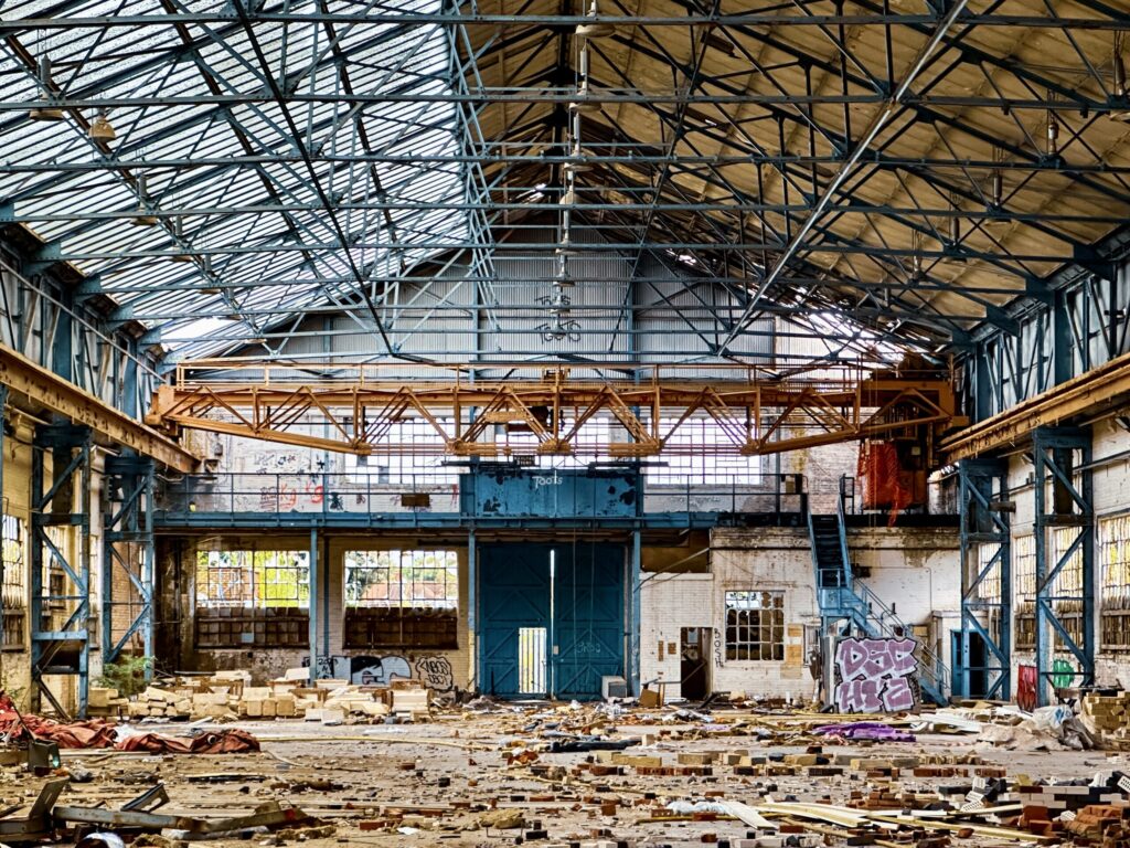 Within Stewartby’s main building, the scale of former operations is palpable, even in decay. This cavernous hall, once echoing with the sounds of relentless production, now holds a profound stillness howling in the wind, its remaining structures bearing witness to the sheer volume of bricks that passed through.