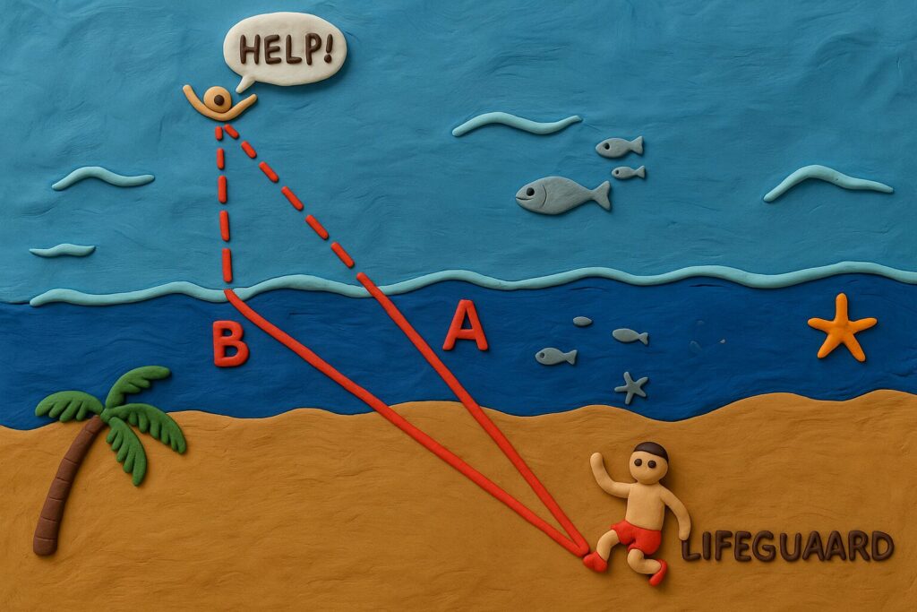 The fastest path for the lifeguard to reach the person lies somewhere between A and B