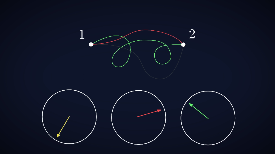 Each of these potential paths that light might explore between two points has a value associated with it, often visualised as a little spinning arrow, with the direction of this arrow determining its phase. The final orientation of this arrow for each path is determined by the total “action” accumulated along that path, divided by Planck’s constant. For light, this action is directly related to the travel time.
