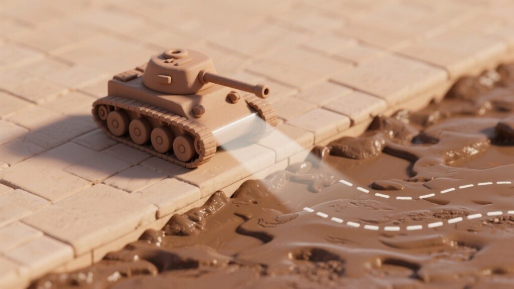 Another common way teachers attempt to expalin refraction is with the “tank tracks” model. This analogy explains that when light moves from one medium to another, it slows down and changes direction. Like a tank going from pavement to mud: when one of its tracks enters a more optically dense boundary first, that track slows, causing the entire tank to gradually turn and slow. A more detailed diagram used by the BBC can be found here.